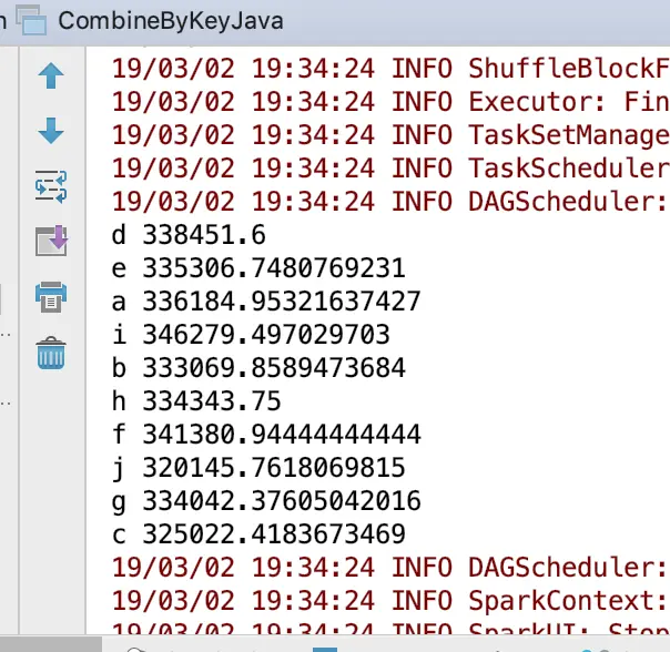 但我们不光说语言,我们分析这个求平均的实现方式,由于java中对数值做了一个处理,因此有保留小数,而scala则没有,但至少可以判断两者的结果是一致的。当然,这不是重点,重点是,这个combinByKey非常复杂,有三个函数。我们很难观察到每个过程做了什么。因此我们在这里,对scala程序进行进一步的输出,从而观察combineByKey到底做了什么。