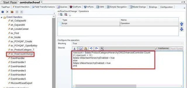 在这个UI模型里有一个事件处理器ev_RowCountChange, 每当表格内记录个数发生变化时会触发。控制newHierarchy按钮是否禁用的模型字段isNewHierarchyEnabled就是在这个事件处理器里进行赋值的。