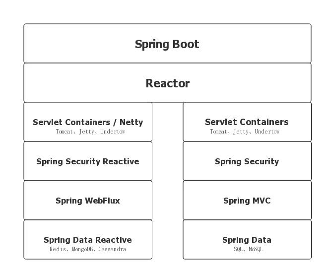 另外,Spring WebFlux 框架目前支持 Servlet 3.1 以上的 Servlet 容器和 Netty,各种模块组成了 Spring Boot 2.x 的工作常用技术栈,如图 1-1 所示。