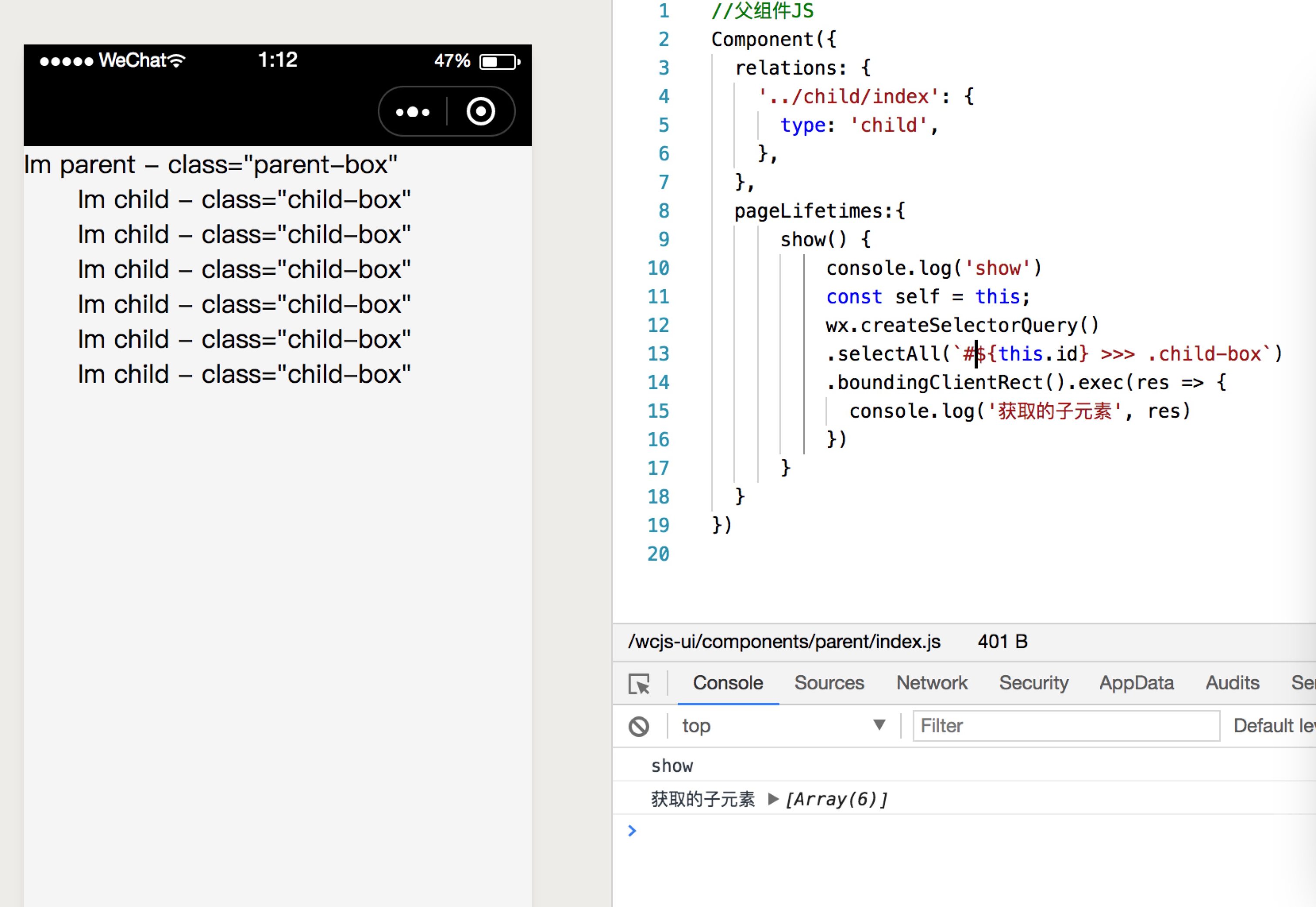 这时我们成功只用一次selectAll获取到了父组件的子元素们。不过这么做有个缺点就是一定要设置id才行,不过为了性能优化我们可以从在父组件中做个判断如果id为空则提示使用此组件需要设置id。
