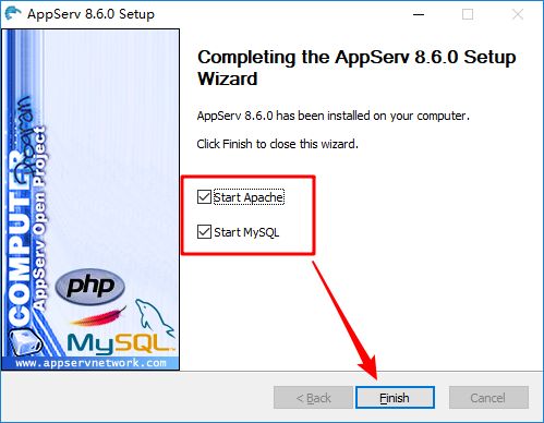 密码输入完毕之后,点击【Install】,软件便自动开始进行安装。安装完毕之后,记得勾选下图红框中的两个选项,开启我们的本地服务器和数据库,最后点击【Finish】,完成安装。