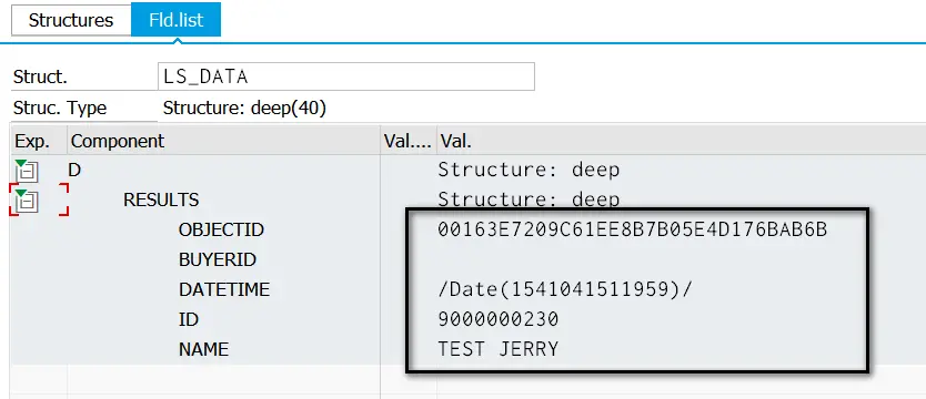 我的任务是解析出上图黑色方框里的几个字段,比如ObjectID, ETag, BuyerID, DateTime, ID, Name等等,把它们的值存储到对应ABAP变量里。
