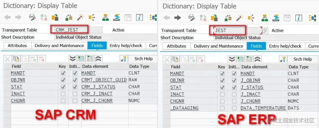 SAP当初在ERP领域取得了辉煌的成功,当开发其他的软件套件比如CRM时,尽管部分模型可以参考ERP的经典设计,比如CRM订单的状态表CRM_JEST几乎就是ERP状态表JEST的照搬: