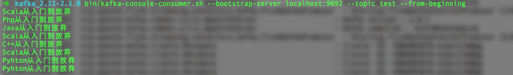 启动一个消费者:bin/kafka-console-consumer.sh --bootstrap-server localhost:9092 --topic test --from-beginning