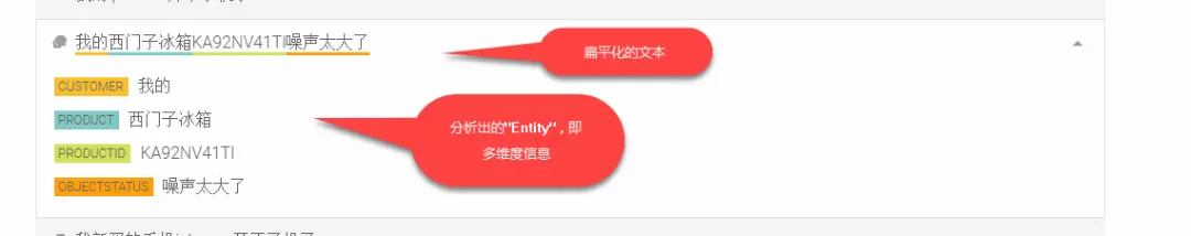 第一阶段,NLP自然语言建模。用户输入的扁平化的文本信息,系统是无法直接识别的,这些文本信息包含了多个维度的信息,比如: "我刚买的iphoneX 开不了机了"。其中 “iphoneX”和“开不了机”,分别代表了产品信息和故障信息两个维度的特性。NLP建模过程,就是把纯文本里包含的这些信息分门别类提取出来,再映射到不同维度上,形成一个多维度立体化的数据模型。具体体现我们这个原型开发里,就是一个json格式的数据。