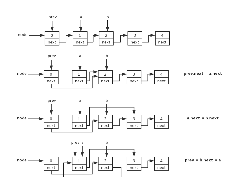 解题思路: 定义一个新的头节点node,将头节点next指向head,定义prev, a, b分别指向前三项,第一遍循环如下图: