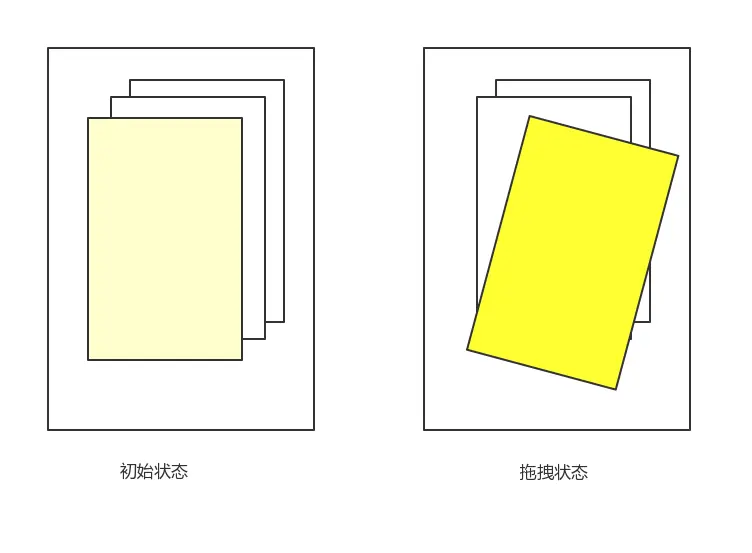 重叠的效果使用Stack很简单,错落有致的效果实在起来可能性就比较多了,比如可以使用Positioned,也可以包裹Container改变margin或者padding,但是考虑到角度的旋转,我选择使用Transform,因为Transform不仅可以玩转位移,还有角度和缩放等,其内部实际上是操作一个矩阵变换;Transform挺好用,但是在Transform多层嵌套的某些特殊情况下,会存在不响应onTap事件的情况,我想这应该是Transform的bug,拖拽事件暂时没有发现问题,这个是不是bug有待确认,暂时不影响使用;