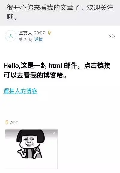 content = '<html><body><h3>Hello,这是一封 html 邮件,点击链接可以去看我的博客哈。</h3>' + '<p><a href="www.weatherfood.com">谭某人的博客</a></p>' + '</body></html>'
