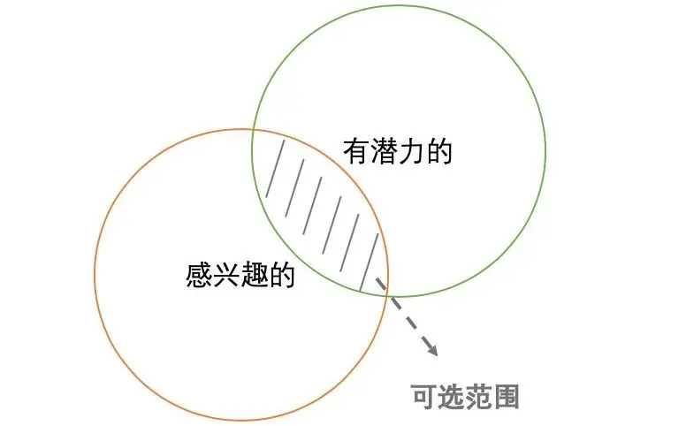 所以这个时期最重要的就是在自己感兴趣的和未来有潜力的两个范围的交集中找到自己的「核心」。就在下图这个位置: