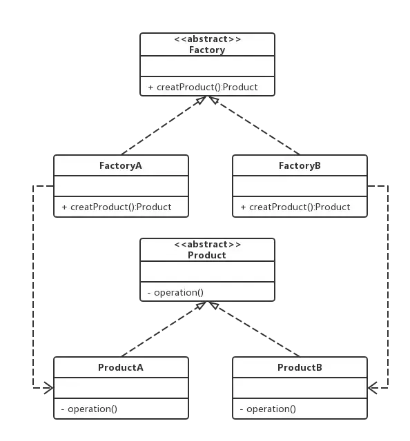 伪代码演示: // 创建产品A Factory factoryA = new FactoryA(); Product productA = factoryA.creatProduct(); // 创建产品B Factory factoryB = new FactoryB(); Product productB = factoryB.creatProduct();