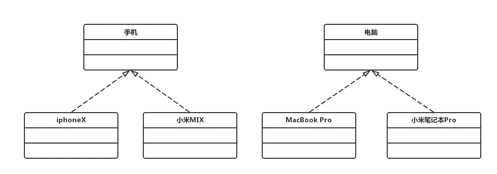 产品等级结构: 等级结构就是继承结构,如上图中手机和电脑,有一个抽象类,然后具体的产品继承这个抽象类