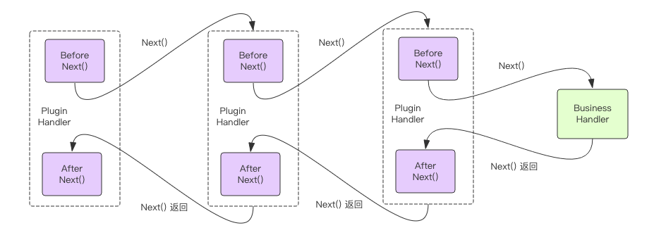 如果在插件中显示调用 Next() 方法,那么它就改变了正常的顺序执行流,变成了像洋葱一样的嵌套执行流。换个角度来理解,正常的执行流就是后续的处理器是在前一个处理器的尾部执行,而嵌套执行流是让后续的处理器在前一个处理器进行到一半的时候执行,待后续处理器完成执行后,再回到前一个处理器继续往下执行。