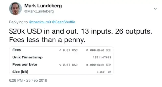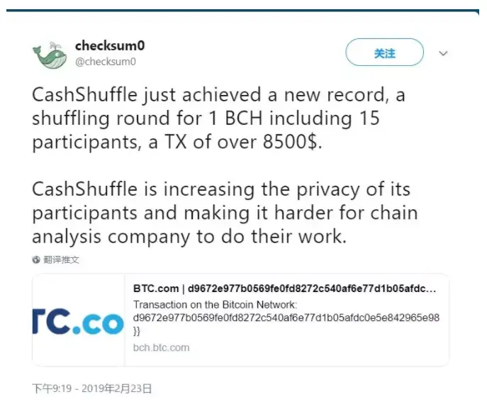 在2月23日,一个推特名为“ Checksum0 ” 的用户表示:“CashShuffle刚刚创造了一项新的记录,一次混币,包括15名参与者,交易额超过8,500美元”。“CashShuffle正在增加其参与者的隐私,并使链上交易分析公司更难以完成他们的工作。”