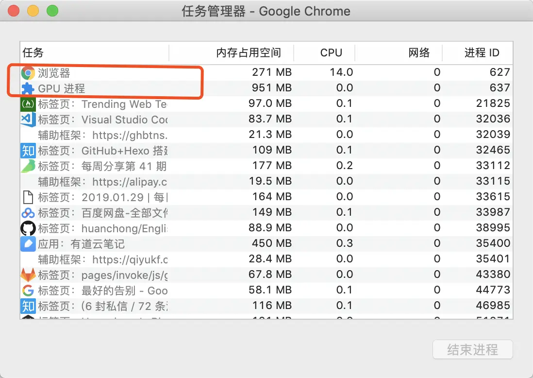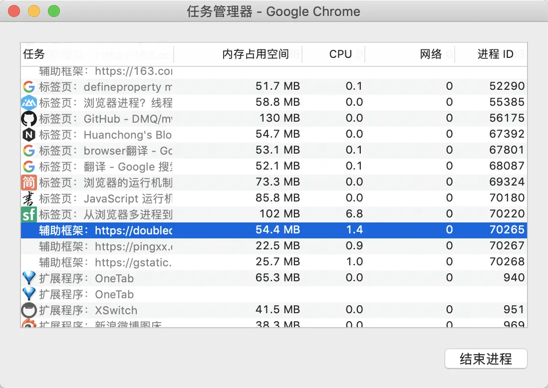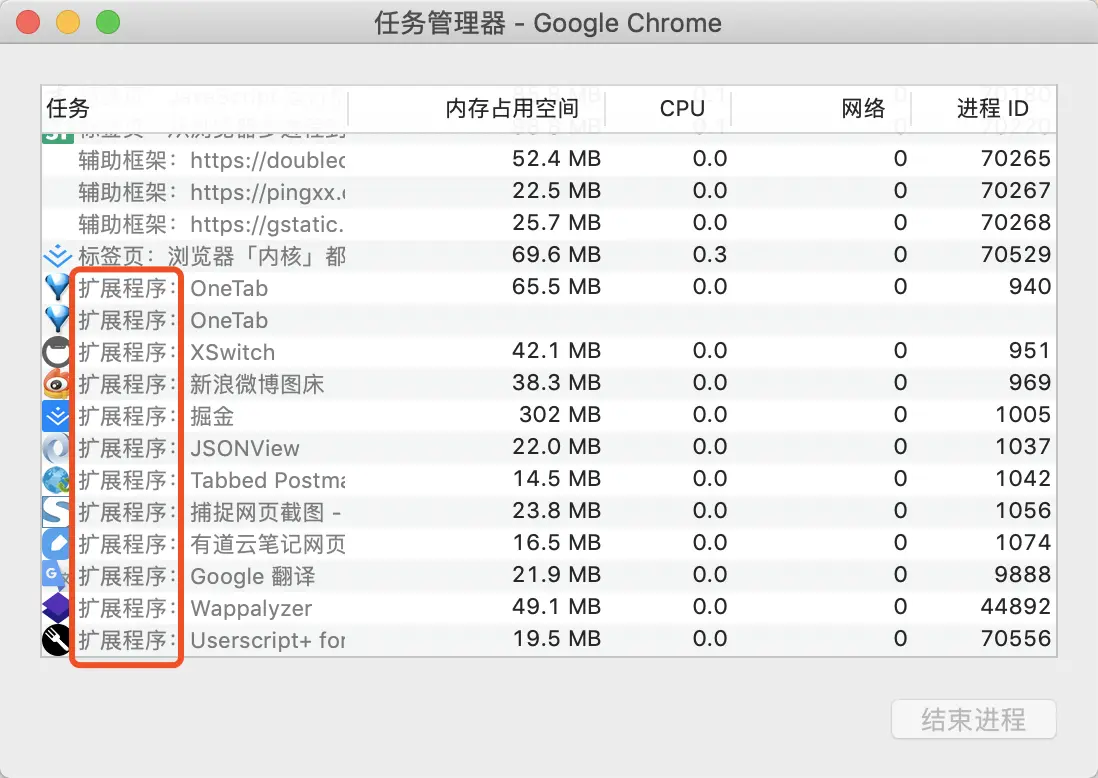在"更多工具" -> "任务管理器"中可以查看当前浏览器中运行的进程 我们可以看到的但不限于以下几种: