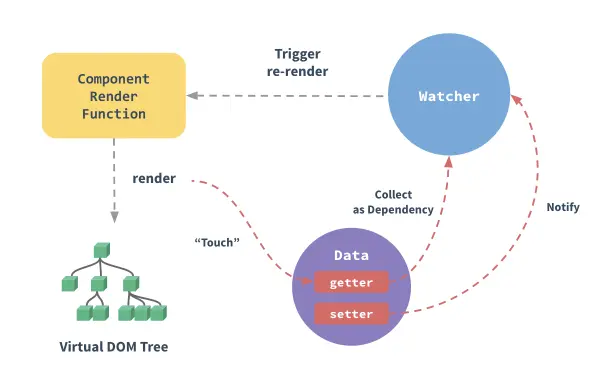 每个组件实例都有相应的 watcher 实例对象,它会在组件渲染的过程中把属性记录为依赖,之后当依赖项的 setter 被调用时,会通知 watcher 重新计算,从而致使它关联的组件得以更新。