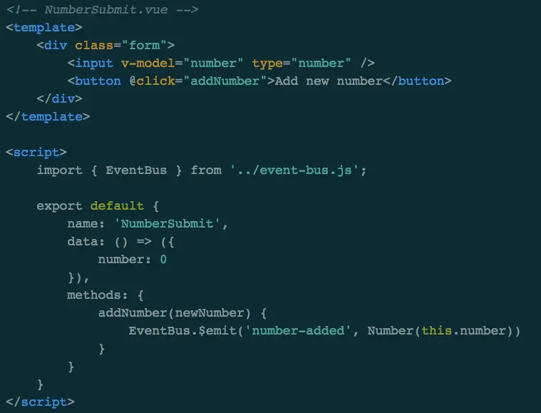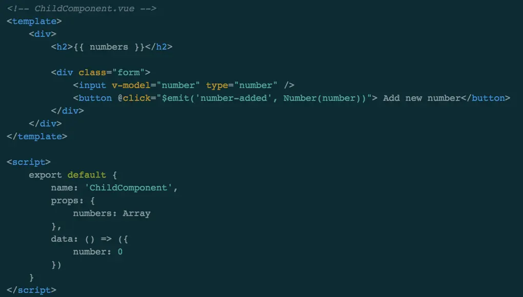 通过上面代码可以看出来子组件通过自定义事件$emit('number-added', Number(number))"传值给父组件,父组件通过@number-added="numbers.push($event)"监听自定义事件接收子组件的传值。