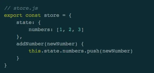 简单的全局存储很接近Flux的状态管理,在store中定义一个初始化对象state和一个addNumbers方法,