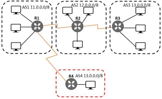 我们在AS1的路由表中可以看出AS4的选择路径和AS3的路径。由于通过AS4到达13.0.0.0/8 的AS路径长度较短,所以R1选择AS4作为下一跳,而不再选择AS2到AS3再到13.0.0.0/8。