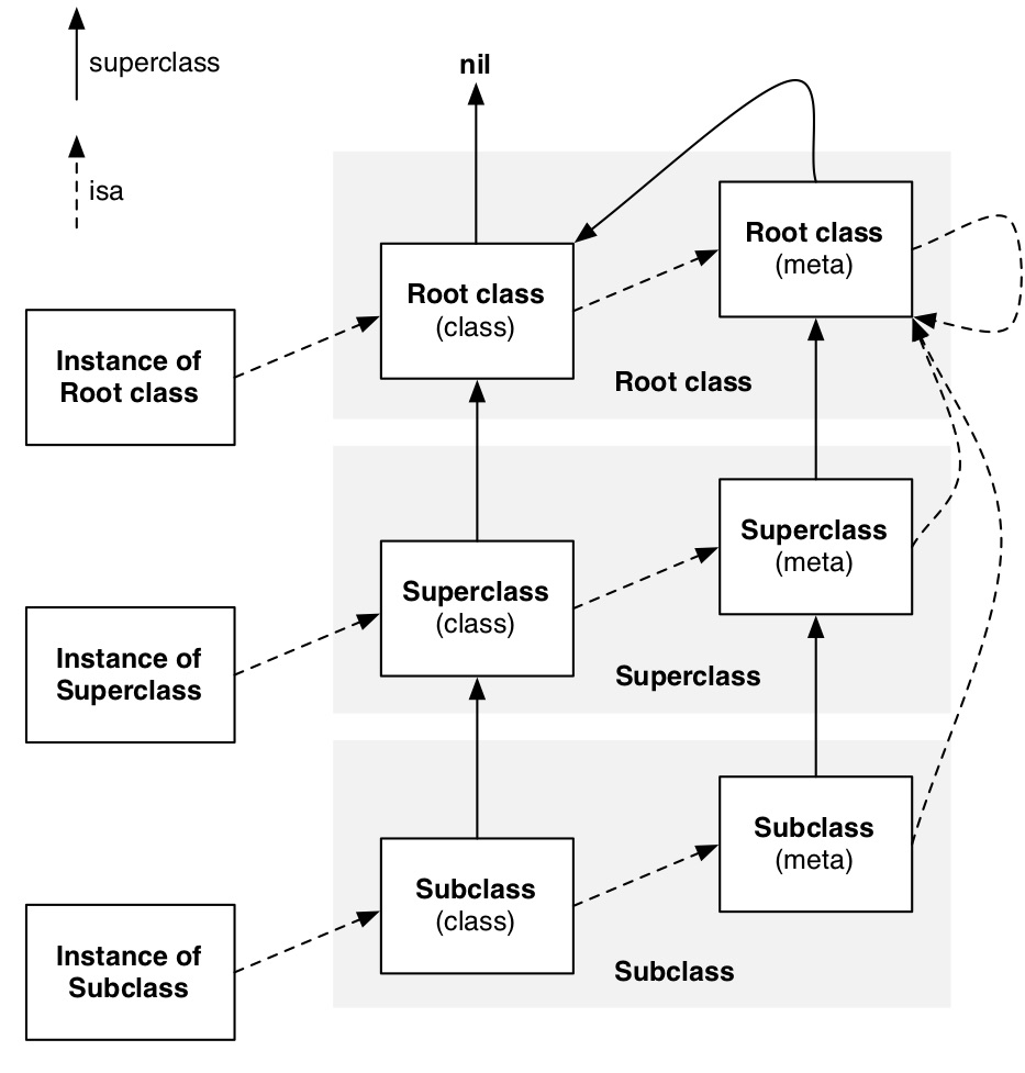 在真正的计算机科学语言理论中,类和元类的分层结构能够有更自由的形式,通过更深层次的元类链以及单个元类的更多的实例。Objective-C 使用元类来实现比如类方法这样的目标,然而在别的方面却意图隐藏元类。例如,[NSObject class] 和 [NSObject self] 是一模一样的,即使在正式的条款中它应该返回一个 NSObject->isa 指向的元类。Objective-C 语言是一套可行的妥协方案。由于限制了类的模式,它才会变成这个样子。