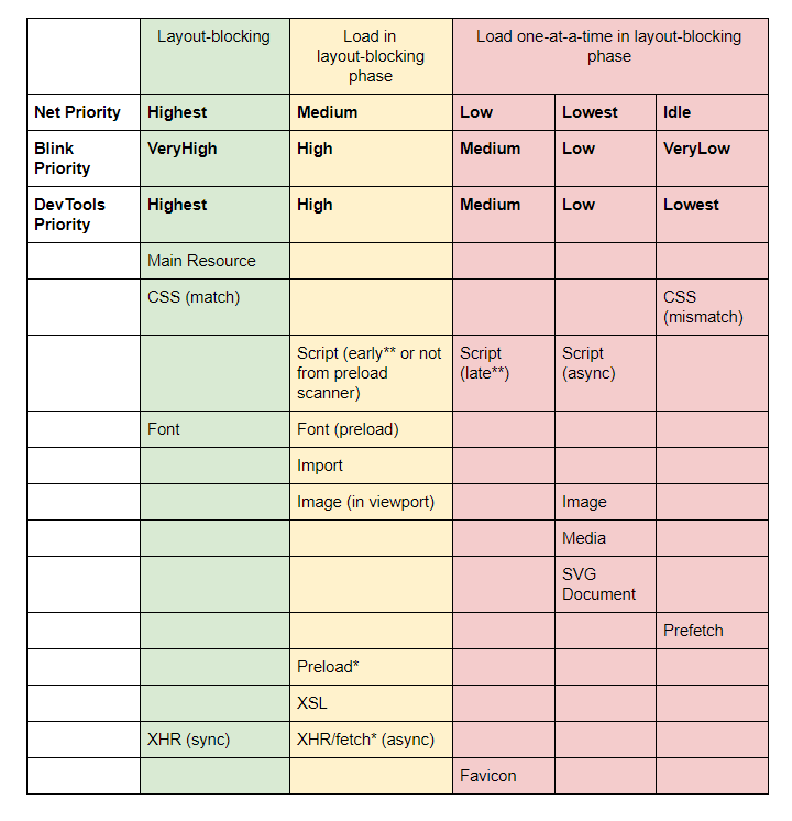 - 对于脚本资源:浏览器会将根据脚本所处的位置和属性标签分为三类,分别设置优先级。