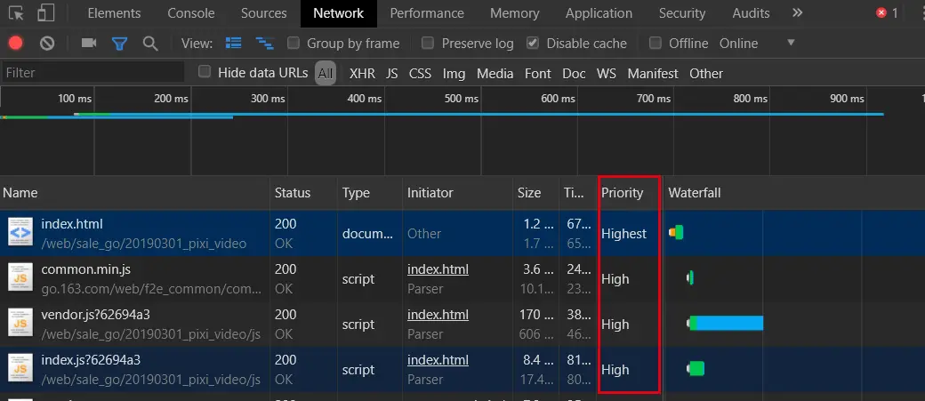 - 对于图片资源:会根据图片是否在可见视图之内来改变优先级。图片资源的默认优先级为 Low 。现代浏览器为了提高用户首屏的体验,在渲染时会计算图片资源是否在首屏可见视图之内,在的话,会将这部分视口可见图片 ( Image in viewport ) 资源的优先级提升为 High 。