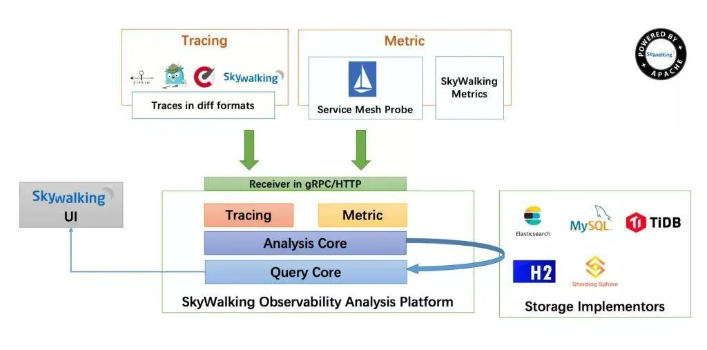 Skywalking 通过服务网格从微服务中提取指标,并利用 Jaeger 等流行工具来跟踪信息,并可以查询和分析这些指标和信息,还可以使用团队开发的 UI 进行可视化。它还提供了一个可插拔的存储接口,借助这个接口,可以将信息保存在一些流行的数据库中,比如 Elasticsearch、MySQL 和 TiDB。