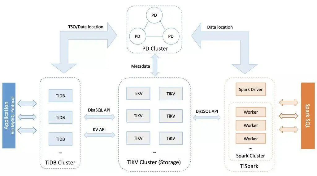 它采用了分层架构,SQL 处理层(左边的 TiDB 集群)和可水平伸缩的存储层(中间的 TiKV 集群)被分隔开来。(注:TiKV 也由 PingCAP 发起,但现在由 CNCF 托管)。这个设计灵感来自于谷歌的 Spanner 和基于 Spanner 构建的 F1 项目。PD(Placement Driver)集群保存元数据,提供一些负载均衡支持,并提供时间戳(作为系统事务模型的一部分)。TiSpark 集群是一个可选组件,用户可以直接基于保存在 TiKV 中的数据运行 Spark 作业。