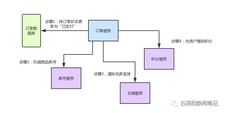用户针对一个订单完成支付之后,就会去找订单服务,更新订单状态