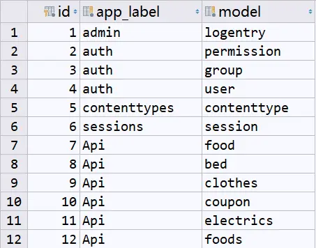 models.py文件的表结构写好后,通过makemigrations和migrate两条命令迁移数据后,在数据库中会自动生成一个django_content_type表: