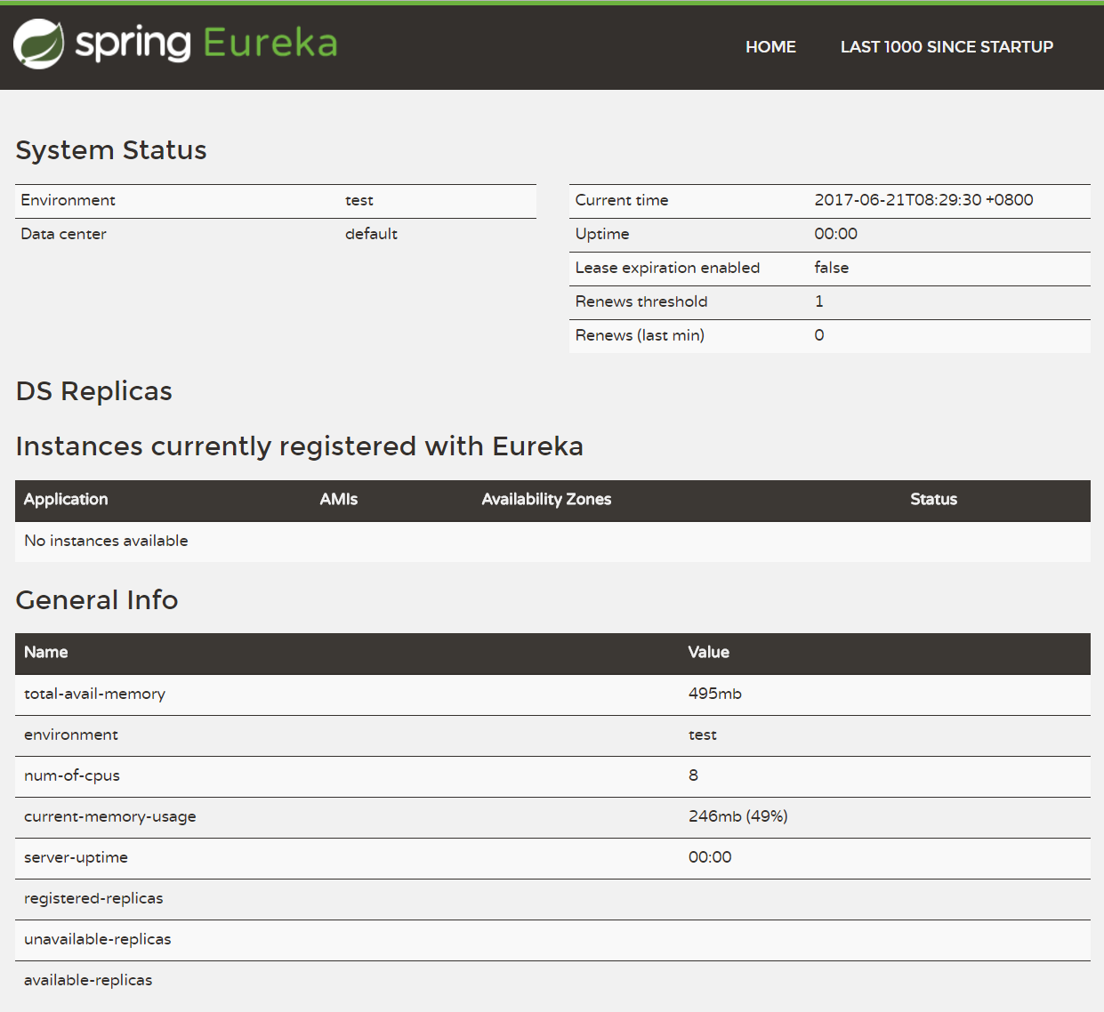 为了与后续要进行注册的服务区分,这里将服务注册中心的端口通过server.port属性设置为1001。启动工程后,访问:http://localhost:1001/,可以看到下面的页面,其中还没有发现任何服务。