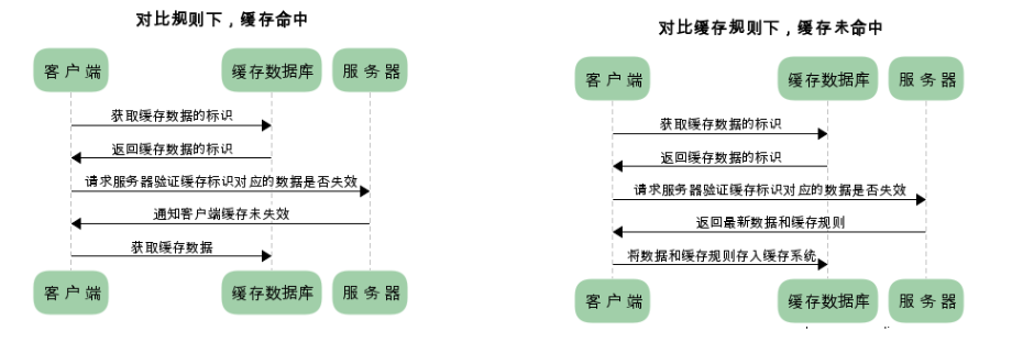 再次请求数据时,客户端将备份的缓存标识发送给服务器,服务器根据缓存标识进行判断,判断成功后,返回304状态码,通知客户端比较成功,可以使用缓存数据。