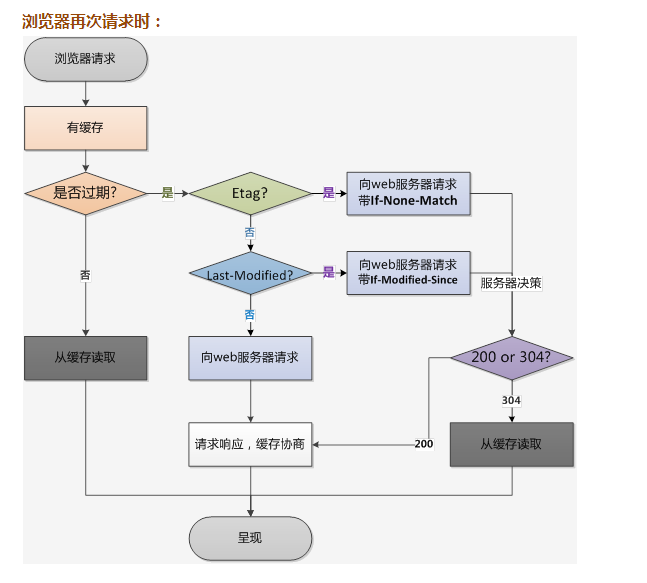 对于比较缓存,将缓存信息中的Etag和Last-Modified通过请求发送给服务器,由服务器校验,返回304状态码时,浏览器直接使用缓存。