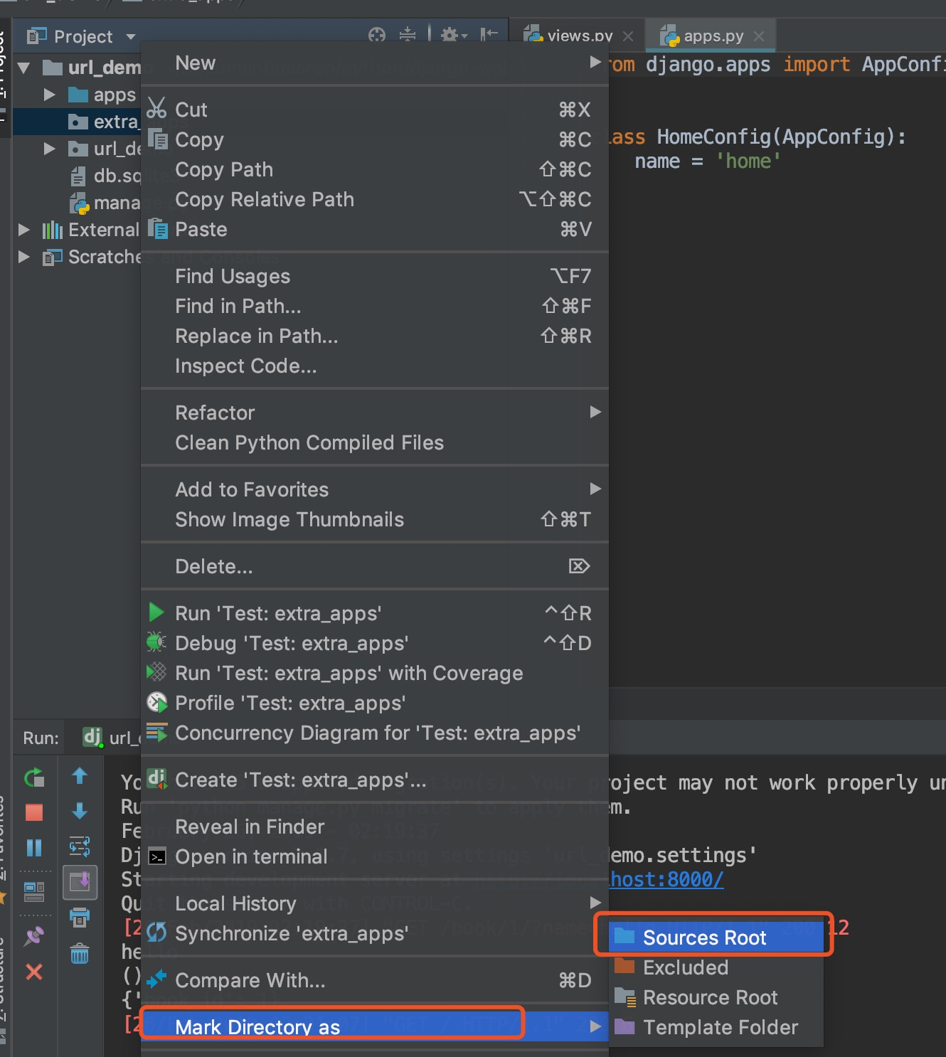 settings.py中添加配置信息import os import sys # Build paths inside the project like this: os.path.join(BASE_DIR, ...) BASE_DIR = os.path.dirname(os.path.dirname(os.path.abspath(__file__))) sys.path.insert(0, os.path.join(BASE_DIR, 'apps')) sys.path.insert(0, os.path.join(BASE_DIR, 'extra_apps')) -
