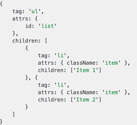 - h(‘<标签名>’, {…属性…}, […子元素…])
