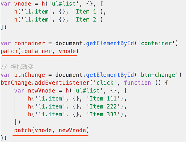 patch(vnode, newVnode) // 找出差异,渲染差异