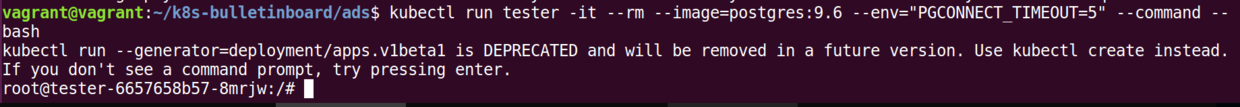 1. kubectl run tester -it --rm --image=postgres:9.6 --env="PGCONNECT_TIMEOUT=5" --command -- bash