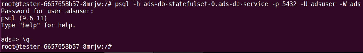 psql -h ads-db-statefulset-0.ads-db-service -p 5432 -U adsuser -W ads
