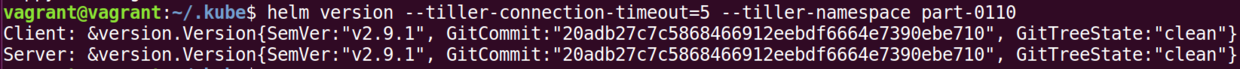 vagrant@vagrant:~/.kube$ helm version --tiller-connection-timeout=5 --tiller-namespace part-0110