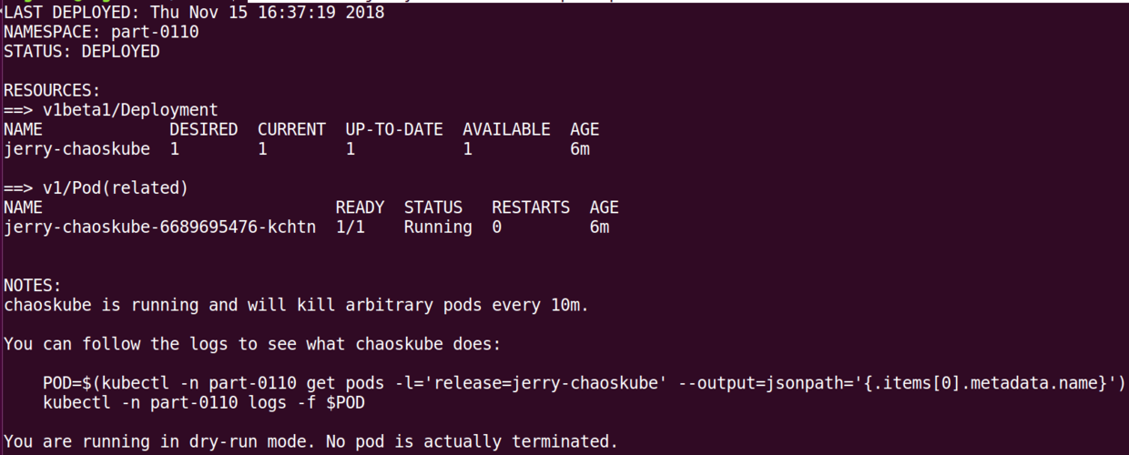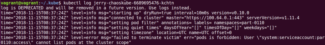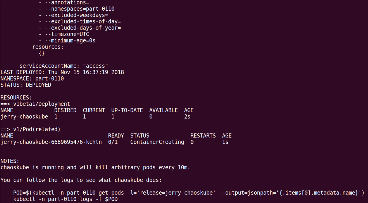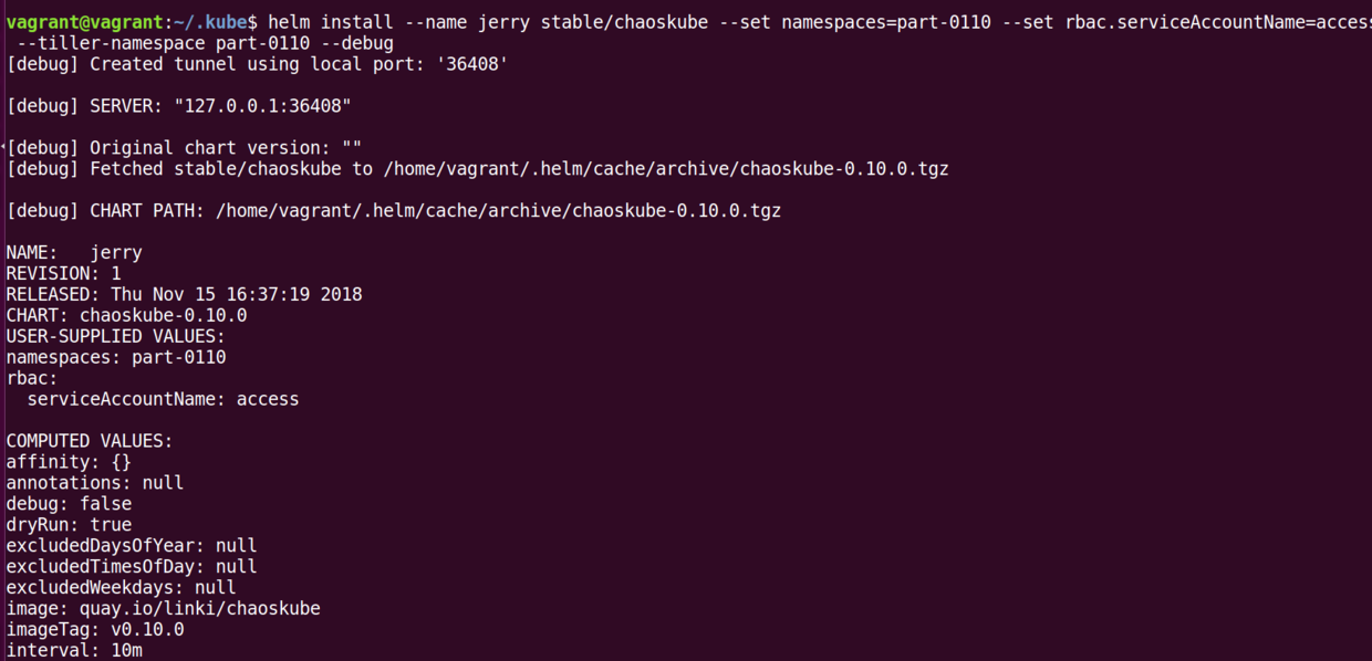 vagrant@vagrant:~/.kube$ helm install --name jerry stable/chaoskube --set namespaces=part-0110 --set rbac.serviceAccountName=access --tiller-namespace part-0110 --debug