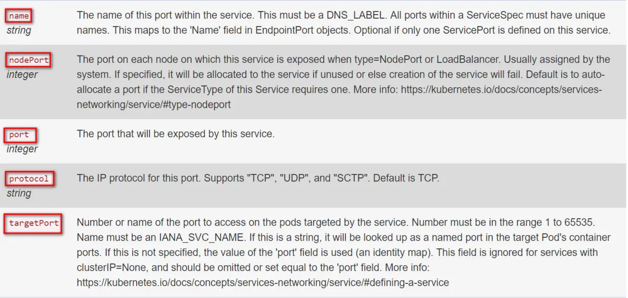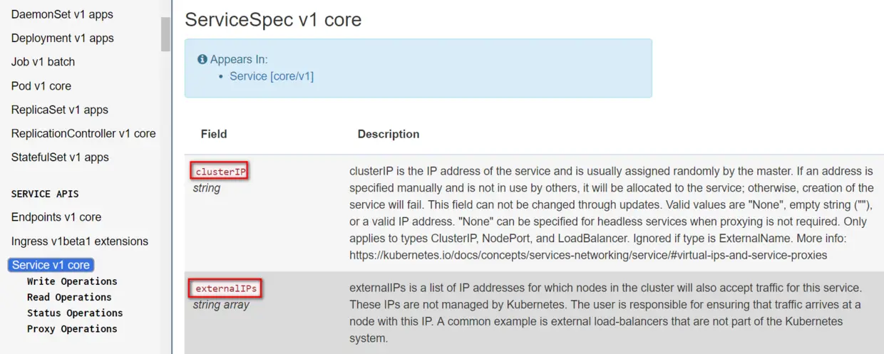 上述Service的yaml文件里每个字段,在Kubernetes的API文档里有详细说明。