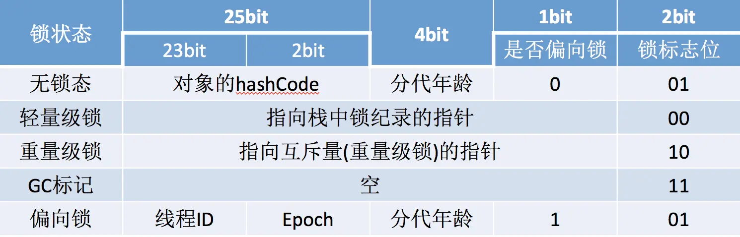 Mark Word 被设计为一个非固定的数据结构以便存储更多的信息,它会根据对象的状态复用自己的存储空间。例如,在 32 位的 HotSpot 虚拟机中,各种状态下对象的存储内容如下: