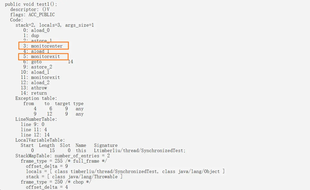 使用 javap -c -v 对 SynchronizedTest.class 进行反汇编: