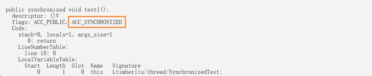 可以看到,被同步的方法也仅是被翻译成普通的方法调用和返回指令。在 JVM 字节码层面并没有任何特别的指令来实现 synchronized 修饰的方法。
