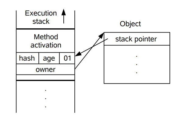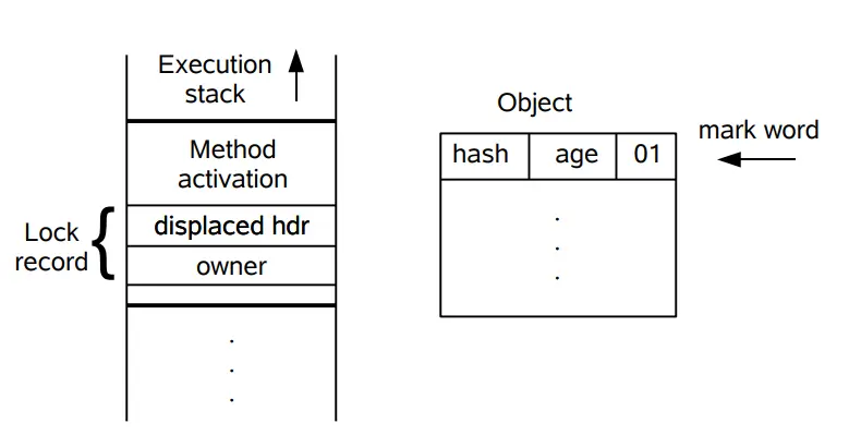 在代码进入同步块时,如果此同步对象没有被锁定(锁标志位为“01”状态),虚拟机将先在当前线程的栈帧中建立一个名为锁记录(Lock Record)的空间,用于存储锁对象目前 Mark Word 的拷贝。如下图,左侧是一个线程的虚拟机栈,右侧是一个锁对象: