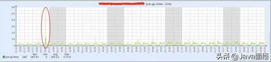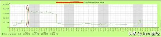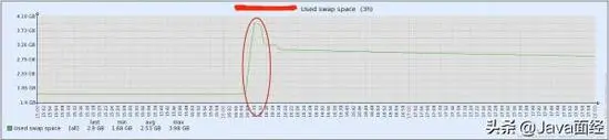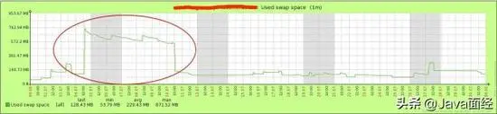 细心的人会发现,引言中给出两个服务器,一个SWAP最多占用了2.16g,另外一个SWAP最多占用了871m;但是,似乎我们的内存缺口没有那么大。事实上,这是由于SWAP和GC同时进行造成的,从下图可以看到,SWAP的使用和长时间的GC在同一时刻发生。