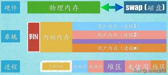 从Linux系统上看,除了引导系统的BIN区,整个内存空间主要被分成两个部分:内核内存(Kernel space)、用户内存(User space)。
