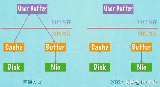 Linux和Java NIO在内核内存上开辟空间给程序使用,主要是减少不要的复制,以减少IO操作系统调用的开销。例如,将磁盘文件的数据发送网卡,使用普通方法和NIO时,数据流动比较下图所示:
