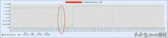 (2)根据前面的模型,Java NIO使用的内存主要分布在Linux内核内存的System区和PageCache区。查看监控的记录,如下图,我们可以看到发生SWAP之前,也就是 物理内存不够使用的时候,PageCache急剧缩小。因此,可以定位在System区的Java NIO Buffer发生内存泄漏。