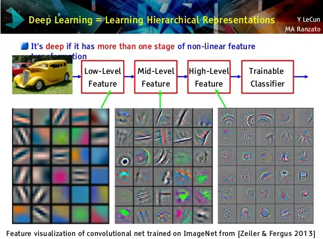 由于深度网络的分层性质而自动出现这种日益丰富的表示,使得图像分类的任务变得微不足道,甚至可以说是小菜一碟。 最后一层所要做的就是权衡车轮和车门的概念,是个汽车汽车;然后有耳朵和有眼睛的,更个像人。