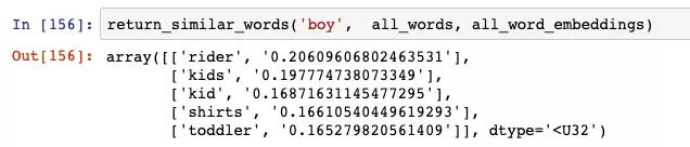 我们可以使用100维的representation来构建一个函数,该函数将帮助我们找到与输入单词最相似的单词。 工作原理很简单:采用100维表示法,找到与数据库中所有其他单词的余弦相似度(cosine similarity)。